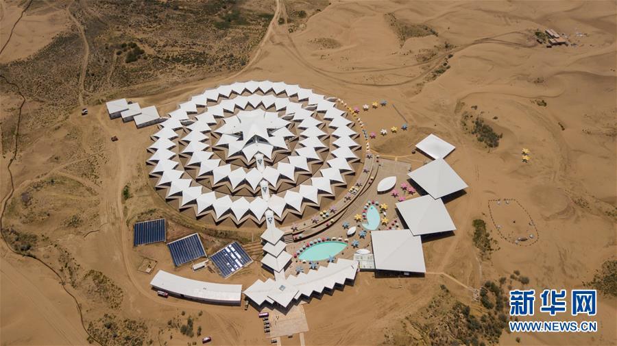 位于內蒙古杭錦旗的七星湖沙漠酒店(8月1日無人機拍攝)。 新華社記者邢廣利攝