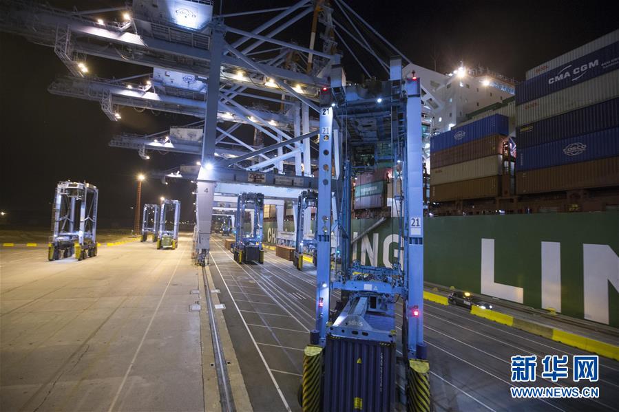 10月15日晚,在比利時(shí)澤布呂赫港集裝箱碼頭,跨運(yùn)車運(yùn)送集裝箱。 新華社記者 葉平凡 攝
