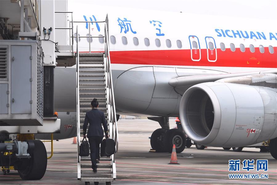 10月16日,航班抵達(dá)重慶江北國際機(jī)場后,湯春燕第一個走出艙門,準(zhǔn)備迎接旅客下機(jī)。 新華社記者王全超攝