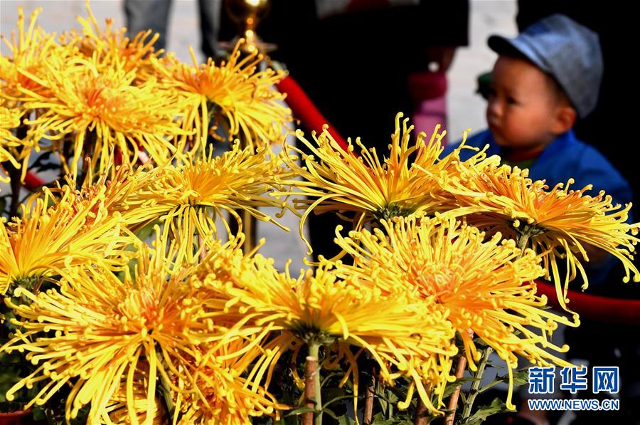 10月17日,一名小朋友在開封龍亭公園內(nèi)觀看菊花。重陽時節(jié),各色菊花競相綻放,把古都開封裝點得分外秀美,吸引眾多游客前來觀賞游玩。 新華社記者 李安 攝