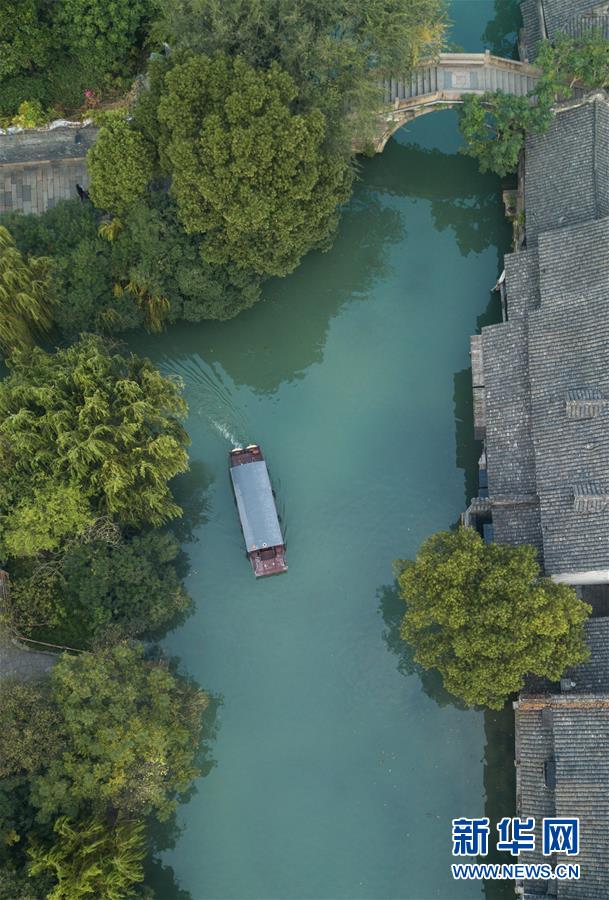 10月18日,一艘游船行駛在烏鎮(zhèn)水道上(無(wú)人機(jī)拍攝)。新華社記者翁忻旸攝