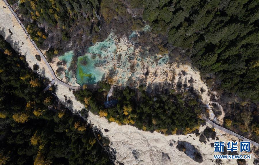 俯瞰黃龍溝盆景池(10月19日無人機拍攝)。深秋時節(jié),在雪山、藍天、白云和彩林映襯下,黃龍溝中的彩池色彩更加斑斕,目前黃龍景區(qū)進入觀賞最佳時節(jié)。黃龍風(fēng)景名勝區(qū)位于四川省松潘縣境內(nèi),以彩池、灘流、雪山、峽谷、森林等聞名,享有“人間瑤池”“圣地仙境”之美譽。新華社記者 江宏景攝