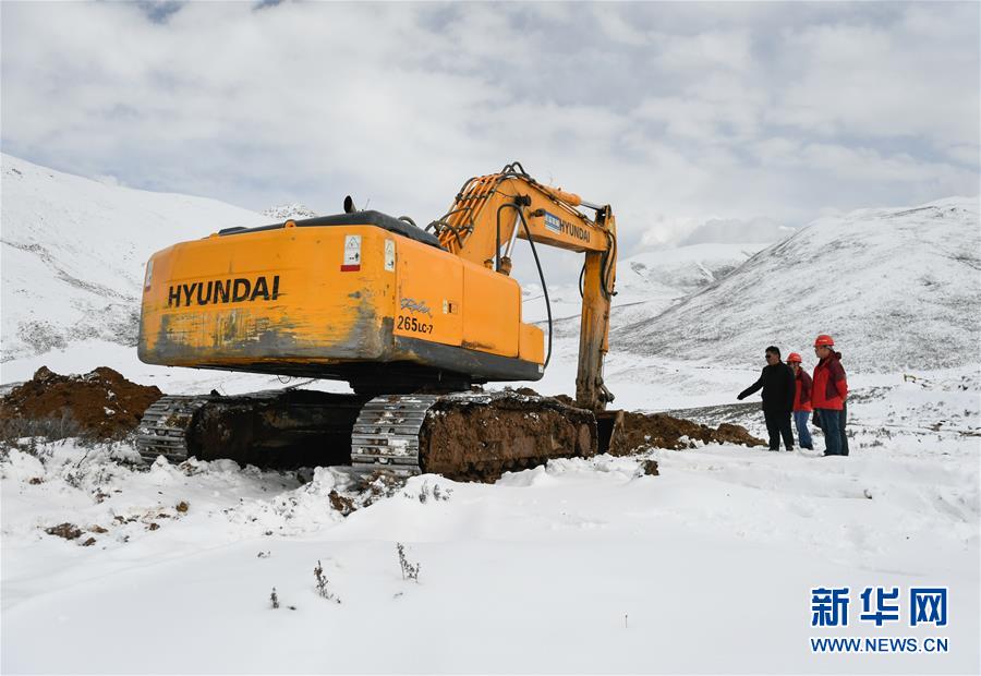 工作人員駕駛大型機(jī)械在昌都市江達(dá)縣的高山牧場上搶通道路(10月14日攝)。新華社記者 劉東君 攝