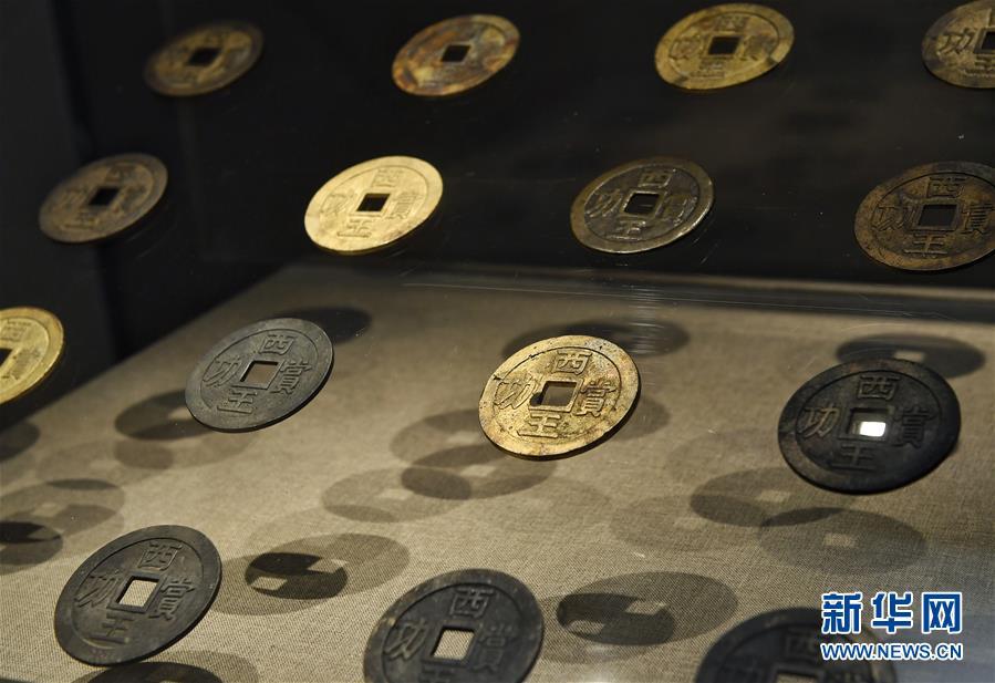 這是在四川博物院展出的“西王賞功”錢(qián)幣(10月21日攝)。 當(dāng)日,由四川省文化廳、四川省文物局、眉山市人民政府主辦的“江口沉銀——四川彭山江口古戰(zhàn)場(chǎng)遺址考古成果展”在四川博物院開(kāi)幕。此次展覽共展出文物521件,展期將持續(xù)至2019年1月18日。四川彭山江口古戰(zhàn)場(chǎng)遺址是2017年度全國(guó)十大考古新發(fā)現(xiàn)之一,共發(fā)現(xiàn)文物42000余件。 新華社記者劉坤攝