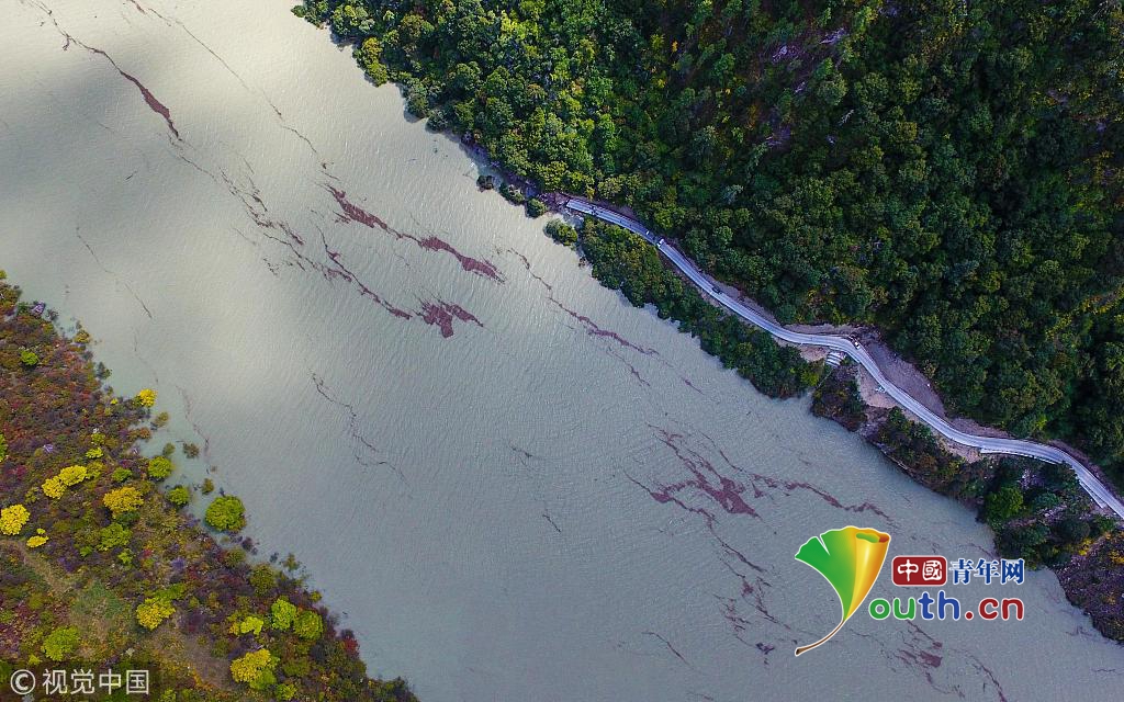 2018年10月18日,通往西藏林芝米林縣加拉村的道路被堰塞湖水淹沒。