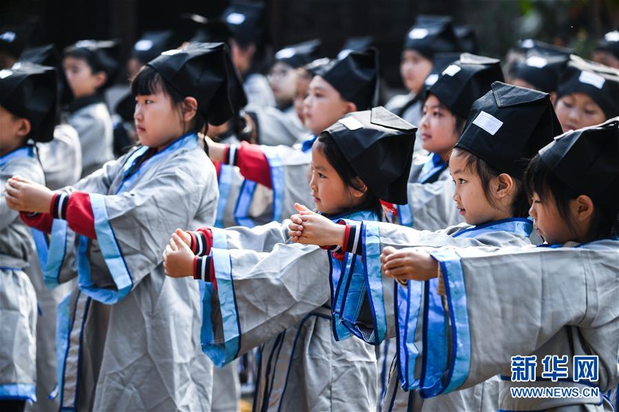 10月23日,學(xué)生們?cè)诶蠋煹膸ьI(lǐng)下學(xué)習(xí)敬拜禮儀。當(dāng)日,浙江省長(zhǎng)興縣第八小學(xué)舉行“誦家規(guī)家訓(xùn),傳中華美德”校園“誠敬日”主題教育活動(dòng),通過誦讀國學(xué)經(jīng)典、講勵(lì)志故事、演美德戲劇等形式,讓學(xué)生感受優(yōu)秀傳統(tǒng)文化。近年來,該學(xué)校立足“誠敬”文化,注重國學(xué)啟蒙教育,讓學(xué)生從小培養(yǎng)“以誠立身、以敬處事”的良好品質(zhì)。新華社記者 徐昱 攝