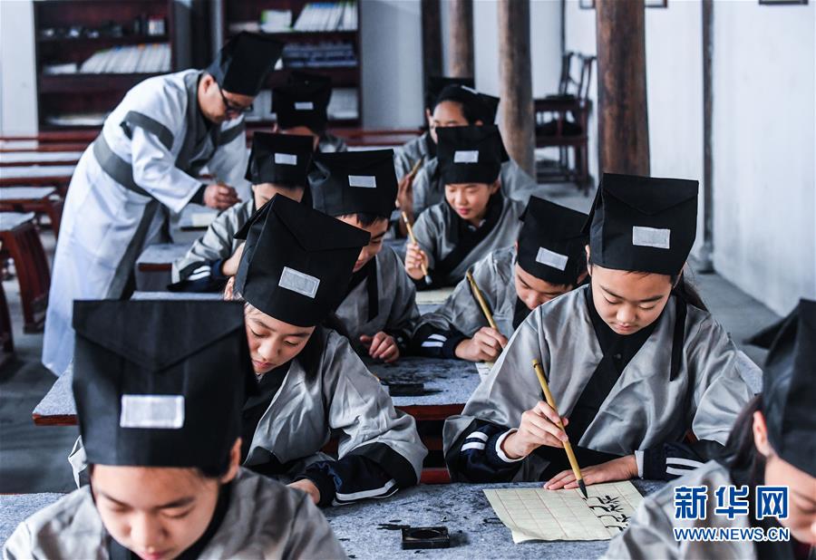 10月23日,學(xué)生們?cè)趨⒓印罢\敬日”傳統(tǒng)書法學(xué)習(xí)。當(dāng)日,浙江省長(zhǎng)興縣第八小學(xué)舉行“誦家規(guī)家訓(xùn),傳中華美德”校園“誠敬日”主題教育活動(dòng),通過誦讀國學(xué)經(jīng)典、講勵(lì)志故事、演美德戲劇等形式,讓學(xué)生感受優(yōu)秀傳統(tǒng)文化。近年來,該學(xué)校立足“誠敬”文化,注重國學(xué)啟蒙教育,讓學(xué)生從小培養(yǎng)“以誠立身、以敬處事”的良好品質(zhì)。新華社記者 徐昱 攝