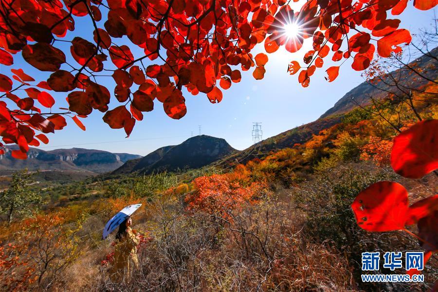 10月24日,游客在河北省武安市賀進鎮(zhèn)后臨河村觀賞紅葉。 金秋時節(jié),位于太行山區(qū)的河北省武安市賀進鎮(zhèn)后臨河村的紅葉進入觀賞佳期。 新華社記者 王曉 攝