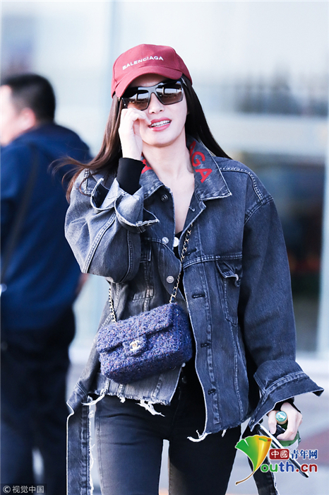 2018年10月24日,北京,“富察皇后”秦嵐現(xiàn)身機(jī)場。她頭戴小紅帽,身穿黑色緊身褲顯美腿筆直修長,上身穿著牛仔外套青春逼人,邊走邊甜笑玩“撩發(fā)殺”,靚麗吸睛。