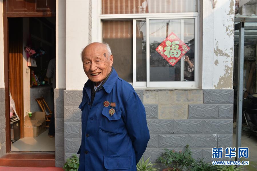 現(xiàn)已83歲的村民姚榮生佩戴紀(jì)念章站在自家院中(10月23日攝)。姚榮生生于1935年,曾參加抗美援朝戰(zhàn)爭,現(xiàn)在開弦弓村與兒孫們生活在一起。 新華社記者 尹棟遜攝