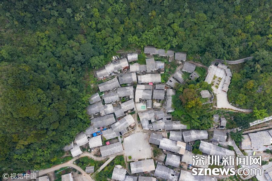 深圳新聞網(wǎng)訊 2018年9月27日,貴州安順,航拍坐落在群山中的鎮(zhèn)寧布依族苗族自治縣高蕩村。鎮(zhèn)寧高蕩村民居為石木結(jié)構(gòu)干欄式石板房,建造時間五、六十年至數(shù)百年不等,建筑保存基本完好。