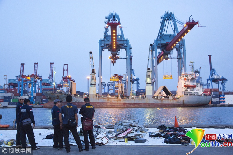 搜救人員打撈上來飛機(jī)的殘骸。