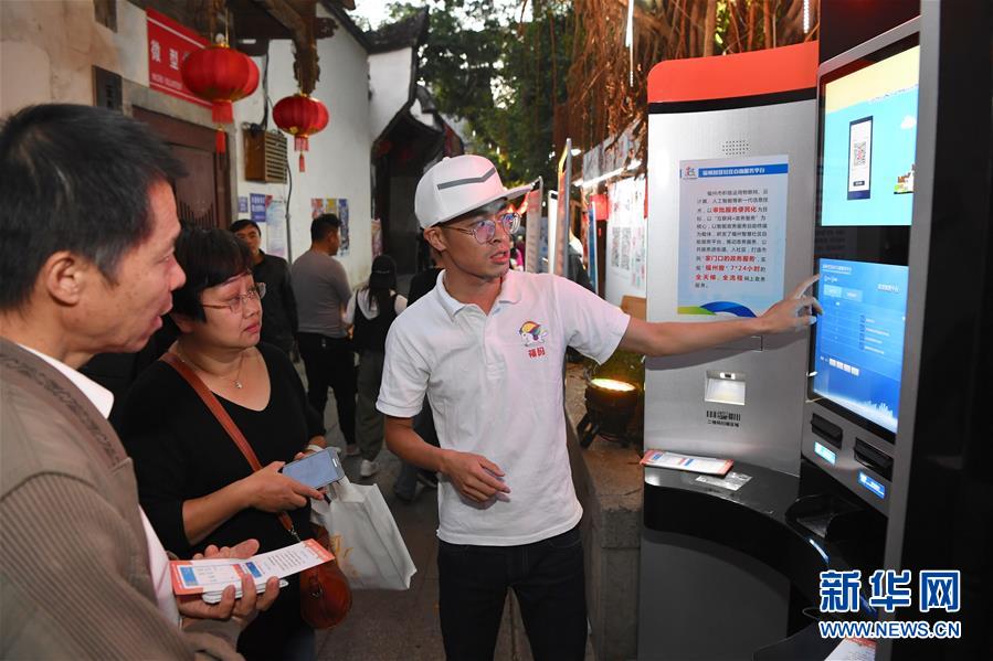 10月29日,工作人員在向市民介紹福州智慧社區(qū)自助服務(wù)平臺。 10月28日至30日,由福州市政府聯(lián)合支付寶主辦的首屆天下碼商大會在福建福州舉行。 新華社記者 姜克紅 攝
