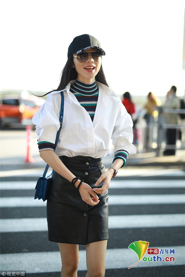 2018年10月28日,上海,韓雪現身機場。她穿裹身皮裙秀長腿、身姿,架黑超帥氣邁步遛機場,衣品氣場雙開掛,自提行李過安檢全程甜笑展親和。
