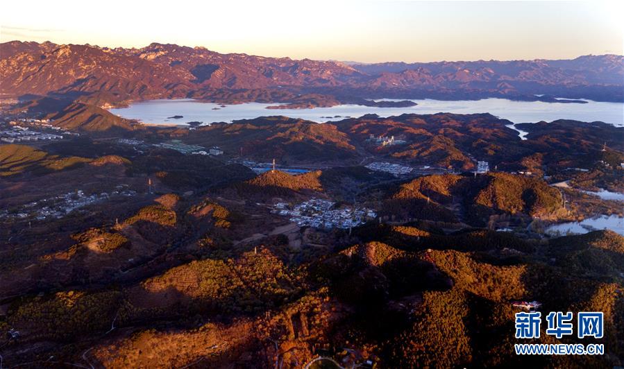 陽光照在北京密云水庫旁的山野上(10月30日無人機拍攝)。