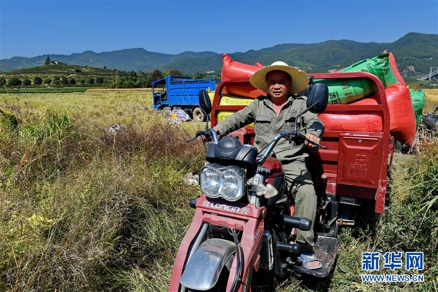 10月31日,武夷山市興田鎮(zhèn)南岸村農(nóng)民在運輸收獲的稻谷。 新華社記者 張國俊 攝