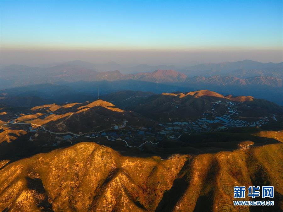 夕陽(yáng)下的摩天嶺草場(chǎng)(11月2日無(wú)人機(jī)拍攝)。金秋時(shí)節(jié),廣西融水苗族自治縣桿洞鄉(xiāng)堯告村的摩天嶺草場(chǎng)天高云淡,景色迷人。新華社記者周華攝