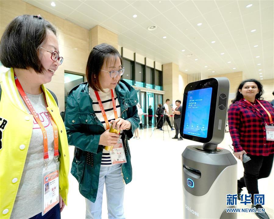 11月4日,媒體記者在首屆中國國際進口博覽會新聞中心和引導機器人互動。 新華社記者陳建力攝