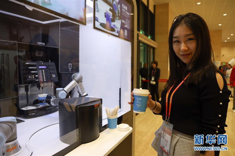 11月4日,一位媒體記者在首屆中國(guó)國(guó)際進(jìn)口博覽會(huì)新聞中心無人咖啡亭品嘗咖啡。 新華社記者 劉大偉 攝