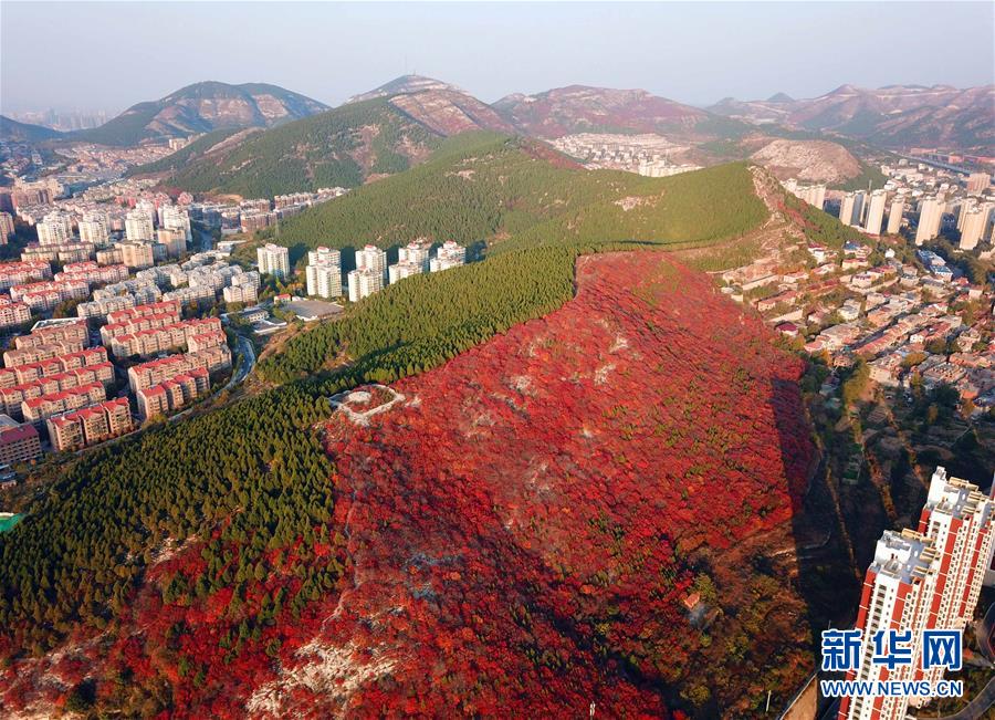 深秋時節(jié),山東濟南楔子山山脊兩邊種植的植被形成“一山雙色”景觀,令人稱奇。