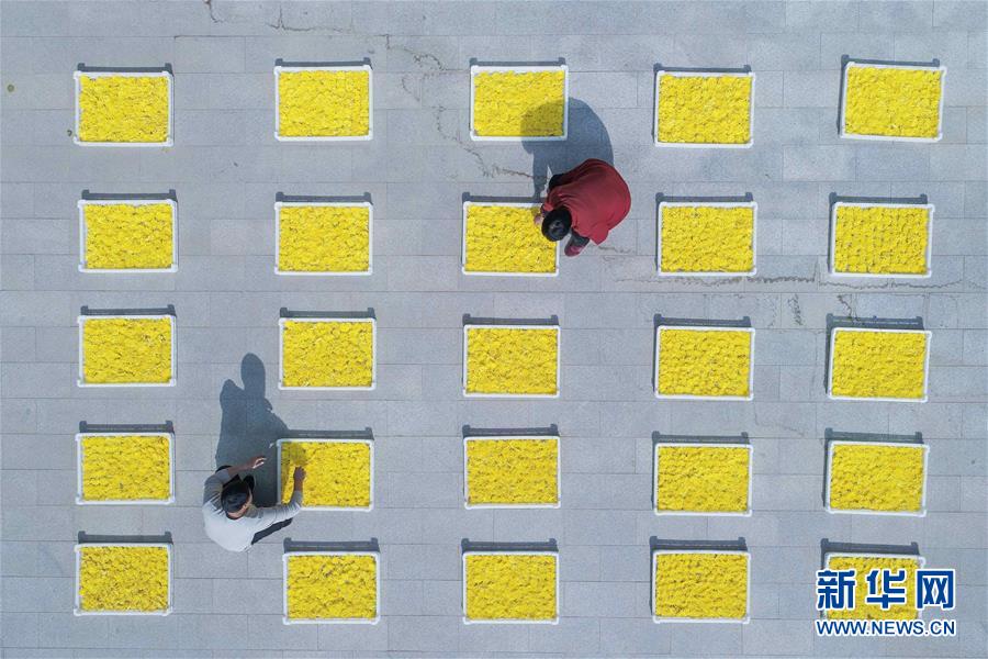 11月7日,河北省魏縣魏城鎮(zhèn)町上村農(nóng)民在分揀晾曬菊花(無人機拍攝)。 新華社記者 朱旭東 攝