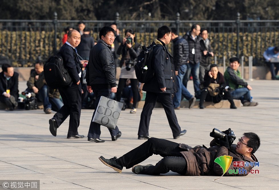 2013年3月5日,北京,一名攝影記者躺在地上仰拍人民大會堂外景。 圖片作者:有待/視覺中國