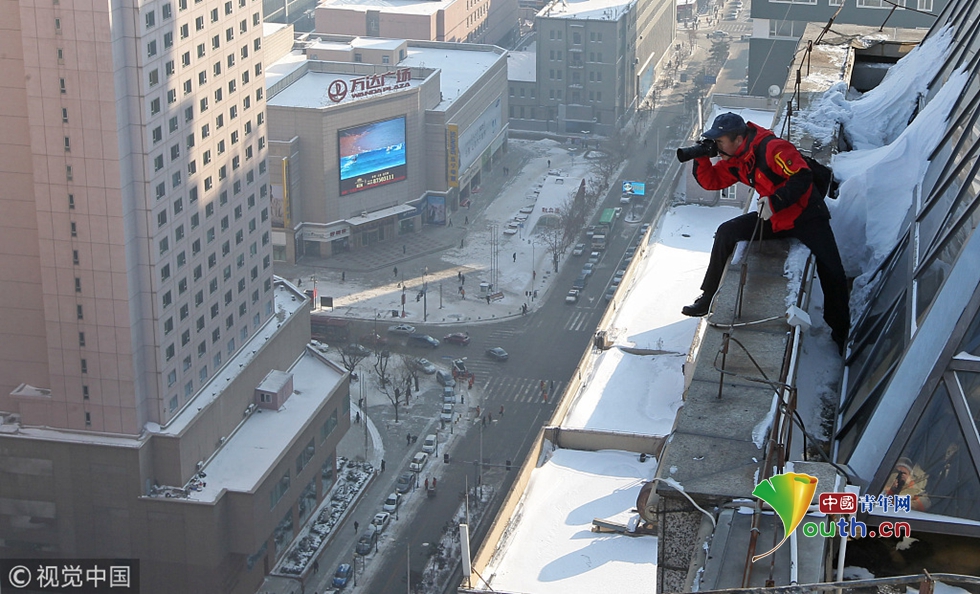 2012年12月4日,為了一個好的角度,郭銳經(jīng)常爬上長春的各種高樓。 圖片作者:白石/視覺中國
