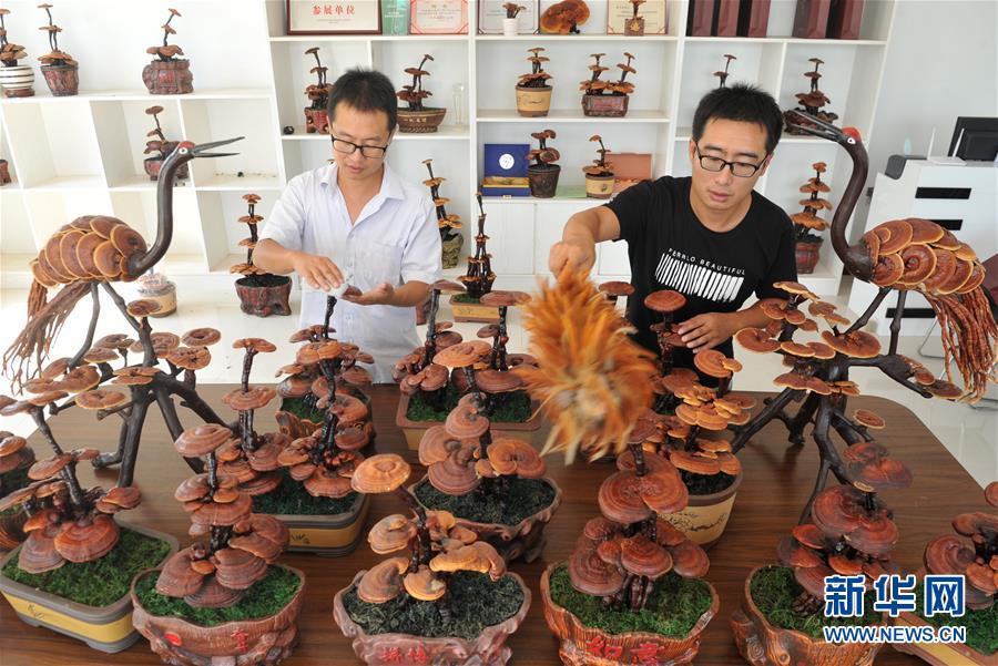 6月20日,廣宗縣大柏社村村民王志恒在展示制作的靈芝盆景。 近年來,河北省廣宗縣大柏社村積極引導(dǎo)農(nóng)民結(jié)合市場(chǎng)需求調(diào)整農(nóng)業(yè)產(chǎn)業(yè)結(jié)構(gòu),采取“公司+合作社+基地+農(nóng)戶”的經(jīng)營(yíng)模式,發(fā)展特色靈芝種植,并開發(fā)出靈芝盆景、靈芝孢子粉等相關(guān)衍生產(chǎn)品,開辟出一條富農(nóng)創(chuàng)收新路徑。目前,大柏社村靈芝種植面積近百畝,種植各類靈芝5000余株,帶動(dòng)120余名農(nóng)民就業(yè)增收。新華社記者朱旭東攝
