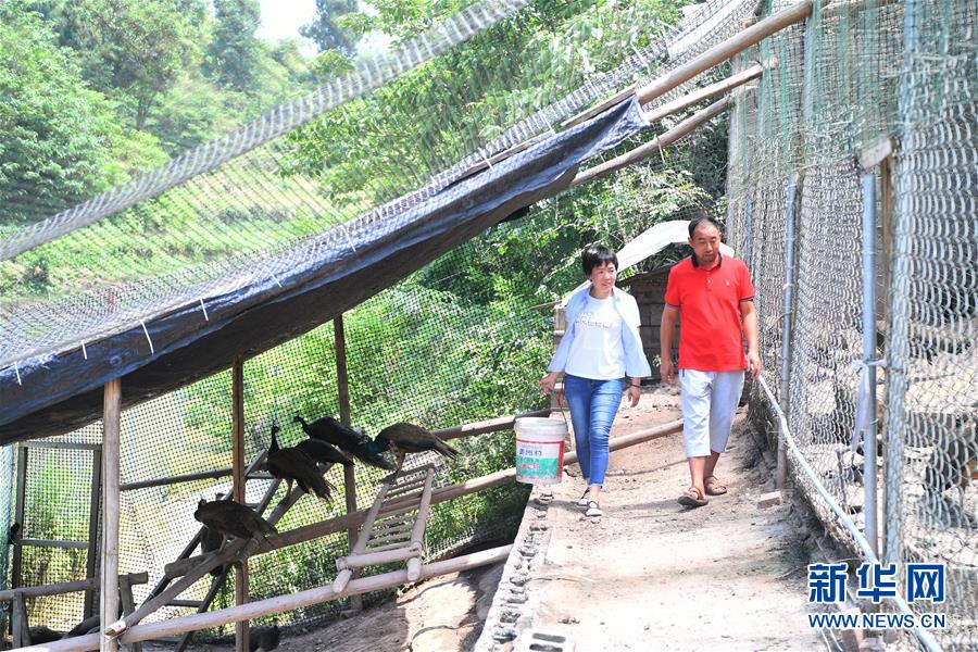 5月16日,在重慶市銅梁區(qū)永嘉鎮(zhèn)高龍村,閻仁兵(右)和妻子張榮蘋在養(yǎng)殖場內(nèi)巡視藍(lán)孔雀生長情況。