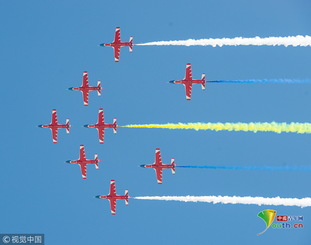 2018年11月8日,廣東珠海,第十二屆中國(guó)國(guó)際航展第三天??哲姟鞍艘弧憋w行表演隊(duì)的隊(duì)員們,發(fā)揚(yáng)連續(xù)作戰(zhàn)精神,給觀眾們表演了七機(jī)分組開花、四機(jī)編隊(duì)橫滾等高難動(dòng)作,受到觀眾們的稱贊。視覺(jué)中國(guó)