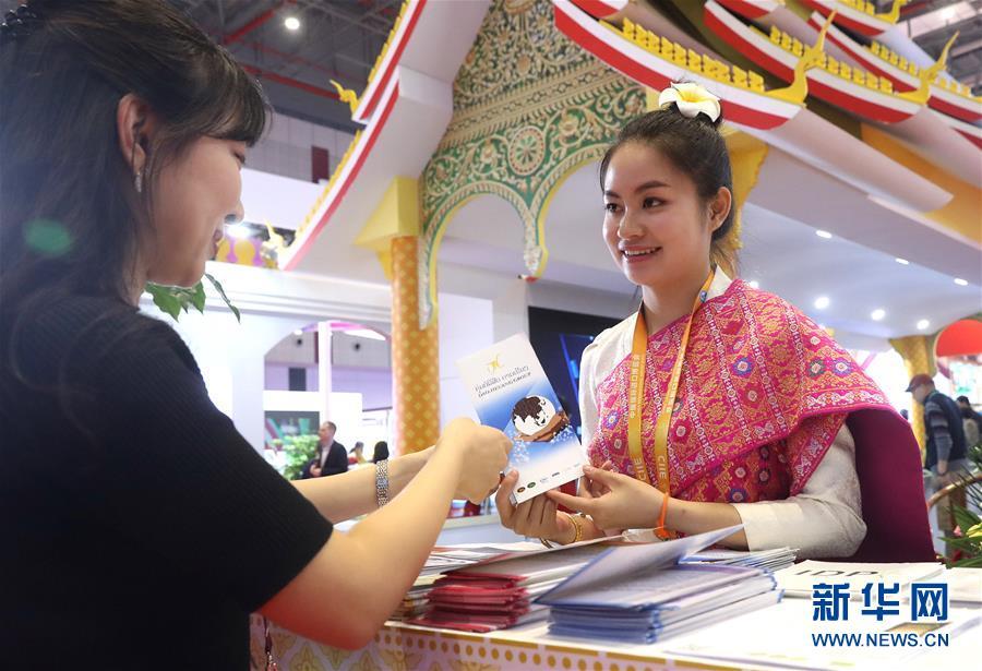 11月7日,在首屆中國國際進(jìn)口博覽會(huì)上,老撾展區(qū)工作人員(右)在向參觀者介紹情況。新華社記者 陳飛 攝