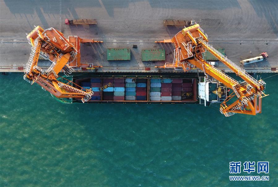 一艘海輪停泊在廣西欽州保稅港區(qū)碼頭裝運貨物(11月3日無人機拍攝)。