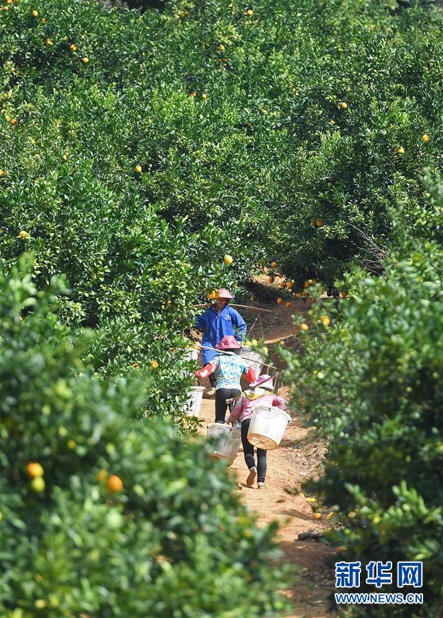 11月11日,江西省尋烏縣澄江鎮(zhèn)周田村的果農(nóng)在挑運(yùn)臍橙。新華社記者 萬象 攝
