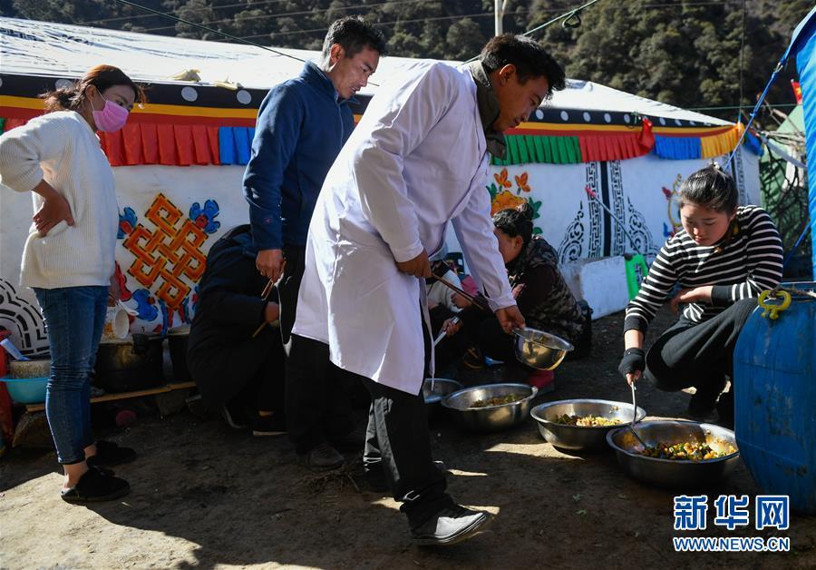 11月12日,在西藏昌都市江達(dá)縣波羅鄉(xiāng)康扎西安置點(diǎn),工作人員在臨時(shí)廚房打飯。 西藏自治區(qū)江達(dá)縣波羅鄉(xiāng)康扎西安置點(diǎn),離波羅鄉(xiāng)政府直線距離約3公里,位于一處地勢開闊平緩的山谷中,比堰塞湖水面高出100多米。10月11日金沙江白格段山體滑坡發(fā)生后,當(dāng)?shù)鼐驮谶@里設(shè)立了安置點(diǎn),安置附近受災(zāi)群眾。 新華社記者 劉東君 攝