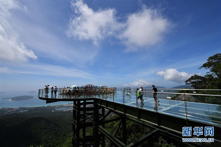 8月31日,游客在玻璃觀景平臺(tái)上參觀游覽。近日,位于海南省三亞市亞龍灣熱帶天堂森林公園的大佛石全海景玻璃棧道開始正式營(yíng)業(yè)。凌空而建的玻璃棧道全長(zhǎng)400米,游客可將亞龍灣的美景盡收眼底。新華社記者郭程攝
