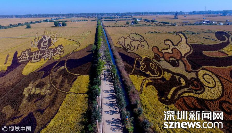 遼寧沈陽(yáng),金秋時(shí)節(jié),沈陽(yáng)盛世祥龍、千手觀音、孔子、厲害啦我的國(guó)、求婚等主題總面積680畝、共15幅具有3D效果的巨幅稻田畫迎來(lái)最佳觀賞期。