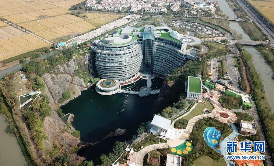 這是位于上海松江佘山腳下的世茂洲際酒店(11月13日無人機(jī)拍攝)。 位于上海松江的世茂洲際酒店11月15日正式開門營業(yè)。這家在一個(gè)廢棄采石礦坑內(nèi)建成的酒店成為上海又一新景。 新華社記者 方喆 攝