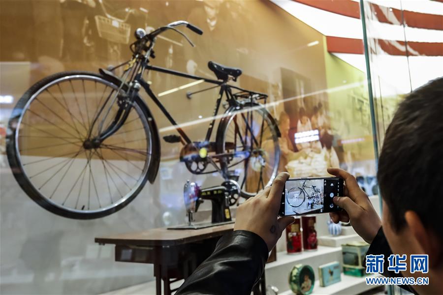11月15日,在“歷史巨變”展區(qū),一名參觀者在拍攝老式自行車(chē)和縫紉機(jī)。