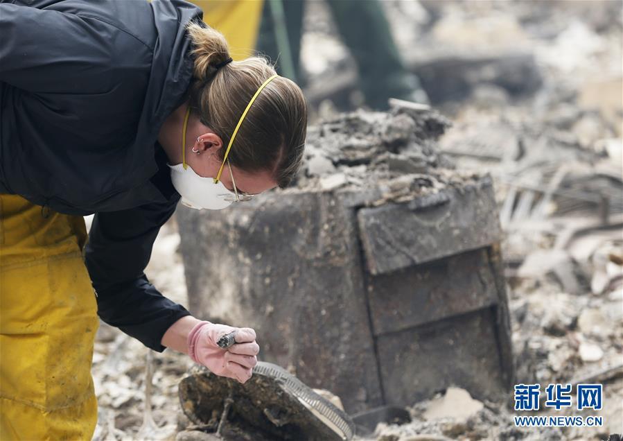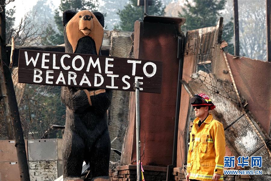 11月18日,在美國加利福尼亞州比尤特縣天堂鎮(zhèn),一名消防人員查看廢墟。 新華社記者吳曉凌攝