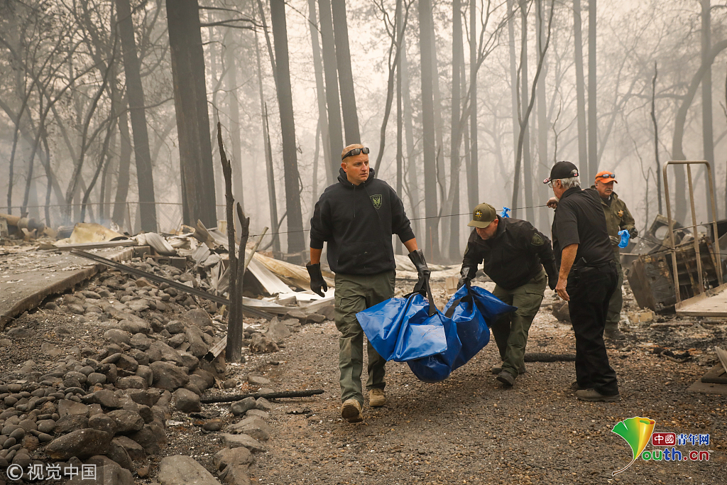 11月18日,在美國加利福尼亞州比尤特縣天堂鎮(zhèn),救援人員在山火廢墟中工作。