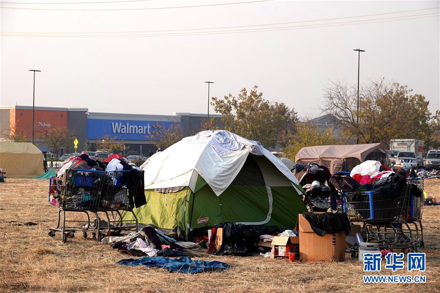 11月18日,在美國加利福尼亞州比尤特縣奇科,災(zāi)民在沃爾瑪停車場搭起帳篷暫居。 新華社記者吳曉凌攝