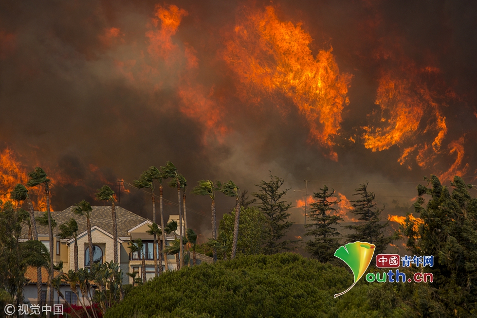 山火迅速蔓延至剛剛發(fā)生槍擊案的千橡樹市,并在9日翻過圣莫妮卡山,在強風的助力下向海邊蔓延。
