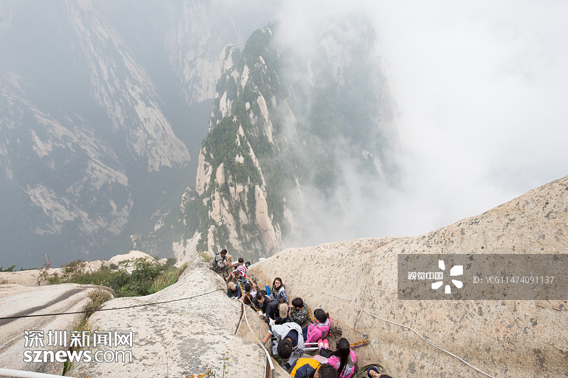 2015年09月18日,陜西渭南,西岳華山歷來被認為是五岳之中最為險峻的,而在華山中,險中之險莫過于“長空棧道”和“鷂子翻身”。華山長空棧道位于華山南峰東側(cè)山腰,是一條具有七百多年歷史的古棧道。棧道上下皆是懸崖絕壁由30多厘米寬的木板和條石搭成,下面是萬丈深淵,僅靠一條鐵索作為抓手,被喻為“華山第一天險”。