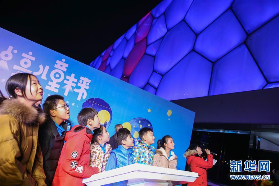 11月20日,在北京舉行的世界兒童日主題活動上,孩子們共同點亮國家游泳中心外墻。 新華社記者張玉薇攝