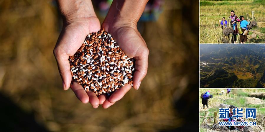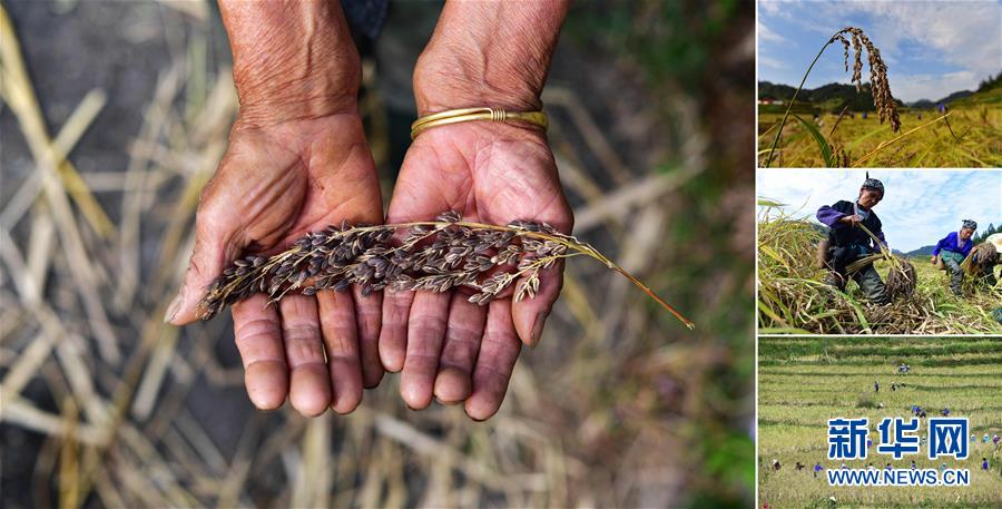 拼版照片:左圖為在安太鄉(xiāng)元寶村,80歲的賈榮專手捧剛剛收獲的香糯;右上圖為成熟待收的香糯;右中圖為賈榮專(左)在收割香糯;右下圖為村民們在收香糯(照片均攝于10月30日)。2017年,賈榮專加入村里的香糯種植合作社。香糯是廣西融水大苗山的特產(chǎn),它生長在高寒高海拔的特殊自然環(huán)境中,產(chǎn)量少,營養(yǎng)價值高。 廣西融水苗族自治縣是國家扶貧工作重點縣,全縣“九山半水半分田”,生活生產(chǎn)環(huán)境較為惡劣,脫貧攻堅任務(wù)艱巨,目前還有7.68萬貧困人口。面對經(jīng)濟(jì)發(fā)展落后、貧困面廣且程度深的現(xiàn)狀,當(dāng)?shù)匕衙撠毠耘c創(chuàng)新產(chǎn)業(yè)扶持相結(jié)合,依托生態(tài)資源優(yōu)勢,實施“特色產(chǎn)業(yè)富民行動”,通過發(fā)展特色民族旅游、林下經(jīng)濟(jì)和特色養(yǎng)殖業(yè)等扶貧產(chǎn)業(yè),帶動貧困群眾依靠勤勞的雙手,拔窮根摘窮帽,實現(xiàn)脫貧致富。據(jù)了解,目前全縣貧困戶參與特色產(chǎn)業(yè)發(fā)展的有2.9萬戶,扶貧產(chǎn)業(yè)覆蓋率達(dá)95%。 新華社記者 黃孝邦 攝