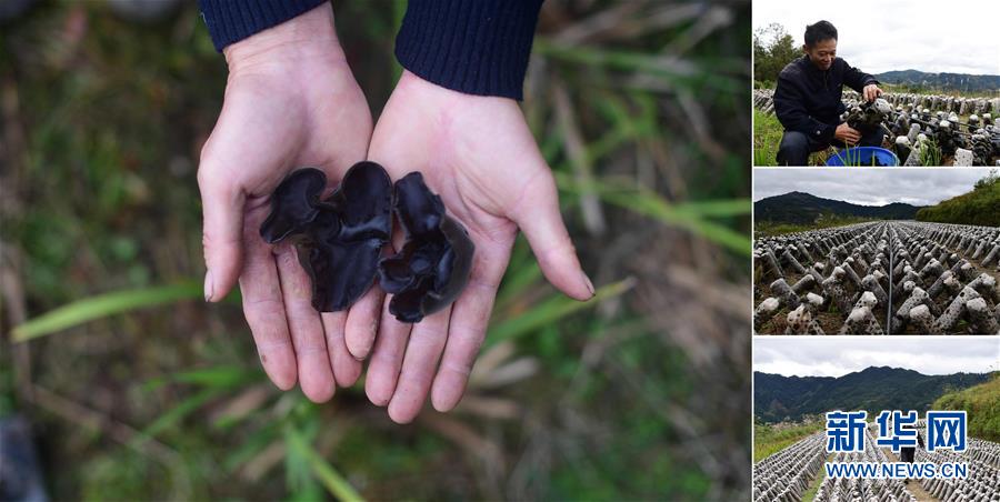 拼版照片:左圖為在大浪鎮(zhèn)上里村,致富帶頭人唐志海手捧剛剛收獲的木耳;右上圖為唐志海在木耳種植基地里采摘木耳;右中圖為木耳種植基地;右下圖為唐志海在木耳種植基地里查看木耳長勢(照片均攝于11月18日)。近年來,上里村依靠發(fā)展紅薯、木耳種植,已于2016年實現(xiàn)脫貧。 廣西融水苗族自治縣是國家扶貧工作重點縣,全縣“九山半水半分田”,生活生產(chǎn)環(huán)境較為惡劣,脫貧攻堅任務(wù)艱巨,目前還有7.68萬貧困人口。面對經(jīng)濟(jì)發(fā)展落后、貧困面廣且程度深的現(xiàn)狀,當(dāng)?shù)匕衙撠毠耘c創(chuàng)新產(chǎn)業(yè)扶持相結(jié)合,依托生態(tài)資源優(yōu)勢,實施“特色產(chǎn)業(yè)富民行動”,通過發(fā)展特色民族旅游、林下經(jīng)濟(jì)和特色養(yǎng)殖業(yè)等扶貧產(chǎn)業(yè),帶動貧困群眾依靠勤勞的雙手,拔窮根摘窮帽,實現(xiàn)脫貧致富。據(jù)了解,目前全縣貧困戶參與特色產(chǎn)業(yè)發(fā)展的有2.9萬戶,扶貧產(chǎn)業(yè)覆蓋率達(dá)95%。 新華社記者 黃孝邦 攝