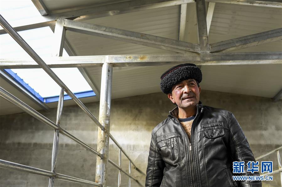 在塔什庫爾干塔吉克自治縣塔提庫力易地扶貧搬遷安置點,都熱·加爾曼在新修的標準化棚圈內(nèi)參觀(11月18日攝)。新華社記者胡虎虎攝
