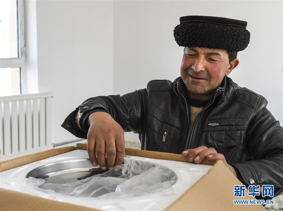 在塔什庫爾干塔吉克自治縣塔提庫力易地扶貧搬遷安置點的新房內(nèi),都熱·加爾曼領(lǐng)取免費發(fā)放的電飯鍋(11月18日攝)。新華社記者胡虎虎攝