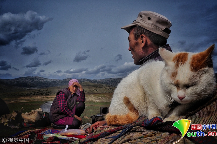 哈薩克族牧民整理行裹準備遷徙。