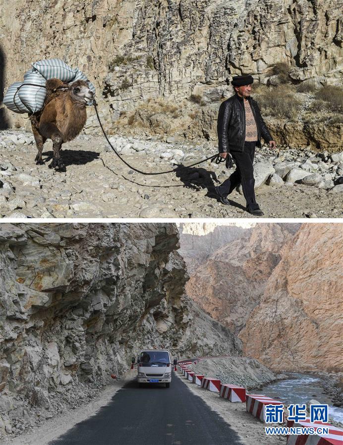 拼版照片:上圖為都熱·加爾曼牽著馱有行李的駱駝走在通往阿克托尕欄桿村村委會的路上;下圖為都熱·加爾曼乘坐汽車從大同鄉(xiāng)前往塔提庫力易地扶貧搬遷安置點(11月17日攝)。新華社記者胡虎虎攝